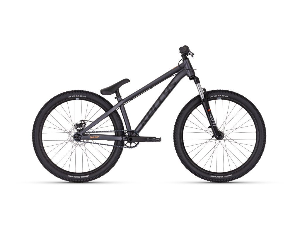 KELLYS Whip 30 DJ Graphite Grey (26″) — Tento dirtový bicykel s 26″ kolesami ponúka pevný duralový rám a jednoduchý 1-prevodový pohon, ideálny na skoky a pumptrack. Vybavený je pružinovou vidlicou (100 mm) a mechanickými kotúčovými brzdami pre spoľahlivú kontrolu aj pri náročnejšími jazde.