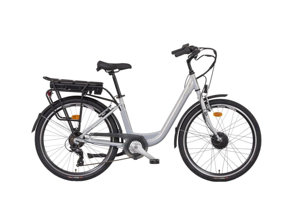 Elektrický mestský bicykel veľkosti 26" v šesťrýchlostnom prevedení, s motorom v prednom náboji, základným akumulátorom 36V/10,4Ah v zadnom nosiči, LCD displejom, tromi stupňami podpory a kompletnou výbavou pre cestnú premávku.